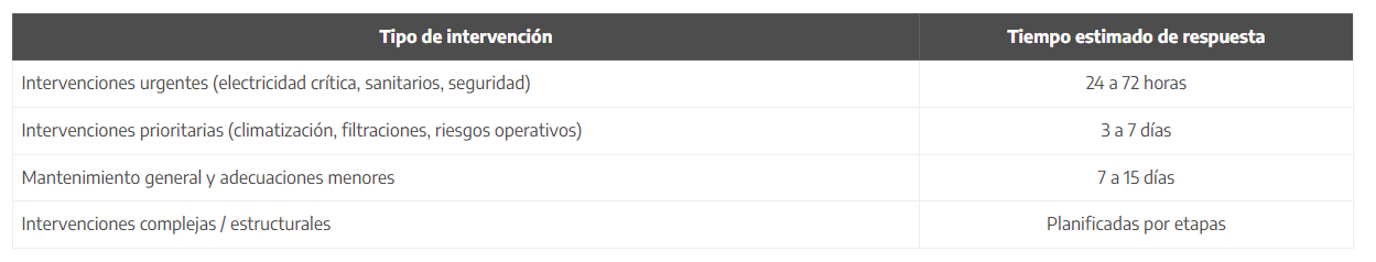 | Intervenciones prioritarias (climatización, filtraciones, riesgos operativos) | 3 a 7 días |