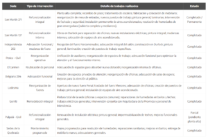 | Sede | Tipo de intervención | Detalle de trabajos realizados | Estado |